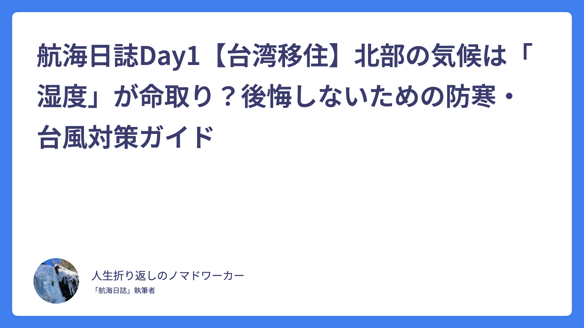 航海日誌Day1【台湾移住】北部の気候は「湿度」が命取り?後悔しないための防寒・台風対策ガイド 2026.02.03 Uncategorized spculeworks@yahoo.co.jp アジア・デュアルライフ・コンパス Asia dual compass
