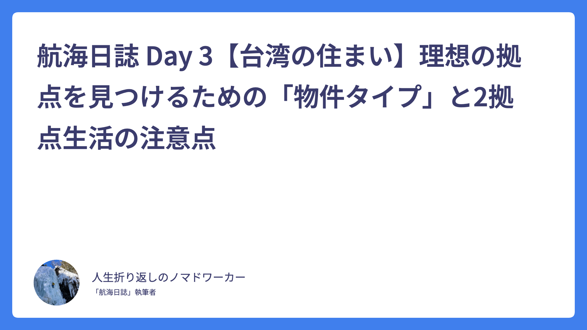 航海日誌 Day 3【台湾の住まい】理想の拠点を見つけるための「物件タイプ」と2拠点生活の注意点 2026.02.03 Uncategorized spculeworks@yahoo.co.jp アジア・デュアルライフ・コンパス Asia dual compass