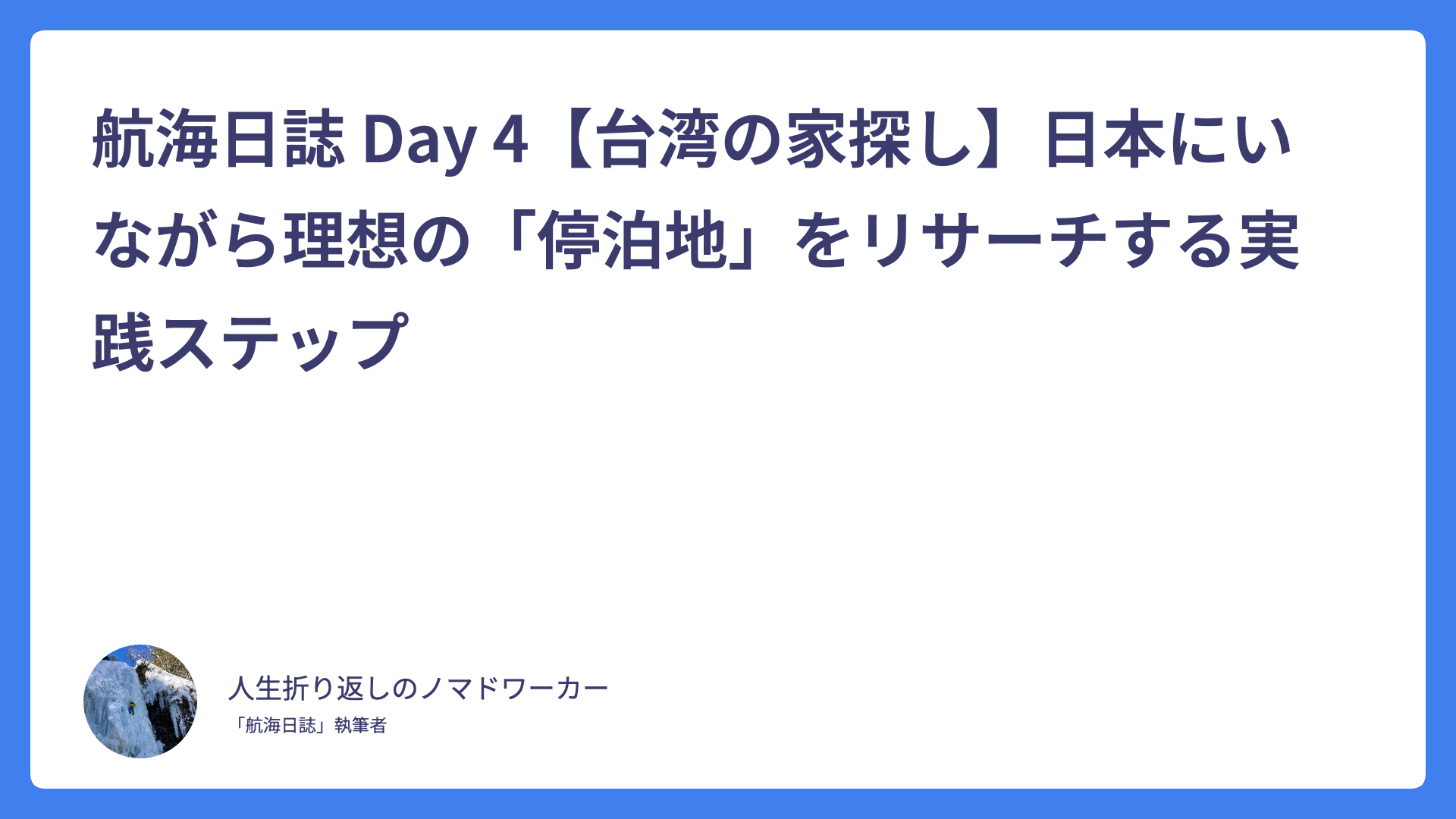 航海日誌 Day 4【台湾の家探し】日本にいながら理想の「停泊地」をリサーチする実践ステップ 2026.02.03 Uncategorized spculeworks@yahoo.co.jp アジア・デュアルライフ・コンパス Asia dual compass