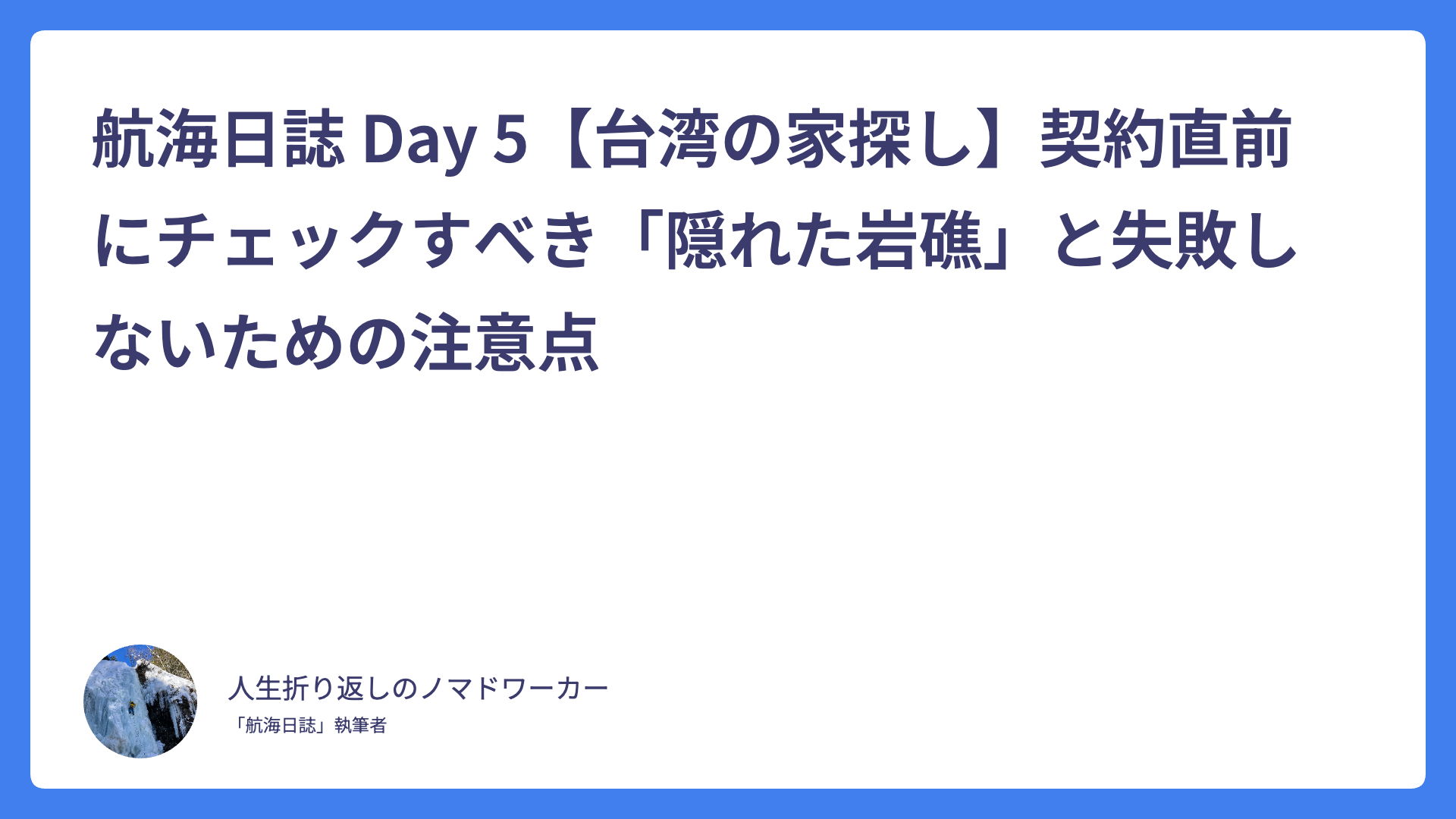 航海日誌 Day 5【台湾の家探し】契約直前にチェックすべき「隠れた岩礁」と失敗しないための注意点 2026.02.03 Uncategorized spculeworks@yahoo.co.jp アジア・デュアルライフ・コンパス Asia dual compass