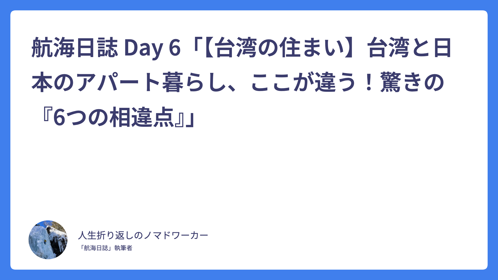 航海日誌 Day 6「【台湾の住まい】台湾と日本のアパート暮らし、ここが違う!驚きの『6つの相違点』」 2026.02.03 Uncategorized spculeworks@yahoo.co.jp アジア・デュアルライフ・コンパス Asia dual compass