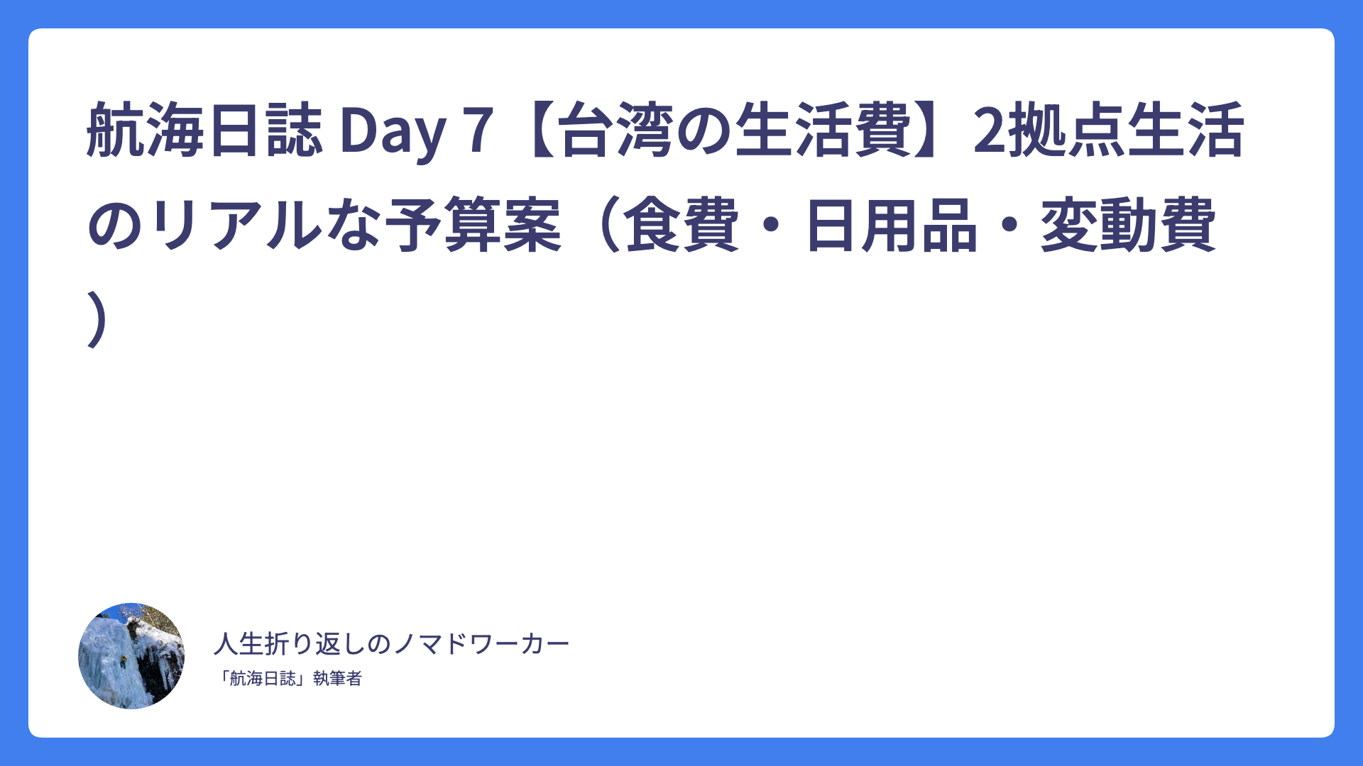 航海日誌 Day 7【台湾の生活費】2拠点生活のリアルな予算案(食費・日用品・変動費) 2026.02.03 Uncategorized spculeworks@yahoo.co.jp アジア・デュアルライフ・コンパス Asia dual compass
