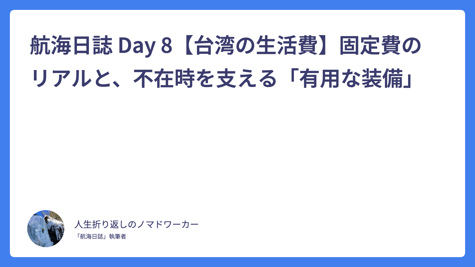 航海日誌 Day 8【台湾の生活費】固定費のリアルと、不在時を支える「有用な装備」 2026.02.03 Uncategorized spculeworks@yahoo.co.jp アジア・デュアルライフ・コンパス Asia dual compass